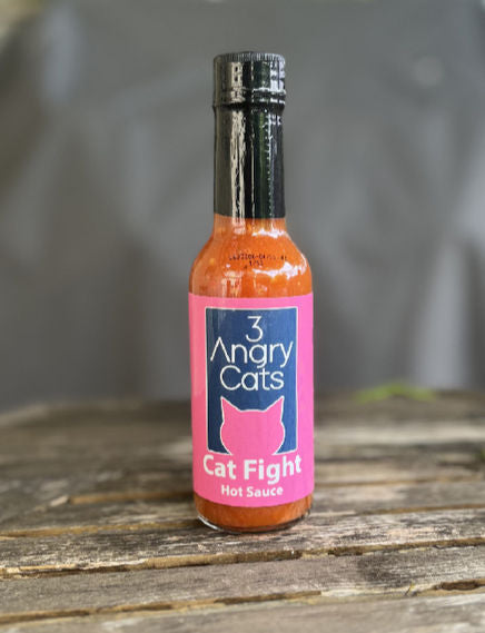 CAT FIGHT - Five Paws on our heat scale A thick unctuous sauce with pepper seeds floating in a bright cheery yellow glow. Pretty in a bottle and better on a plate! The Scotch Bonnet peppers pack flavours and depth that means this sauce makes a great marinade. Its fruitiness begs to be brushed on to white fish fillets or slathered on slabs of tofu that is then grilled. Delicious mixed through hot plain rice with fresh parsley and pine nuts. So pretty it is almost too good to eat!