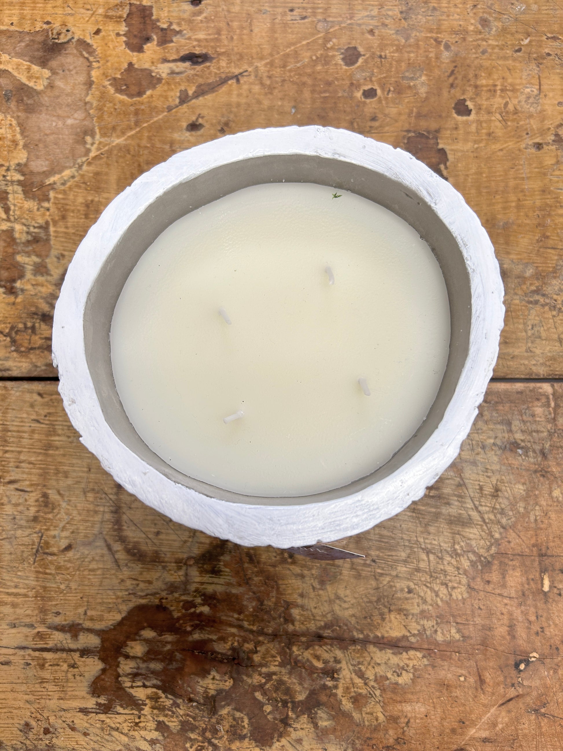 Bark Look candle crafted from cement. This rustic candle has 4 wicks for an even burn. Measures 4.5 inches H x 6" diameter.