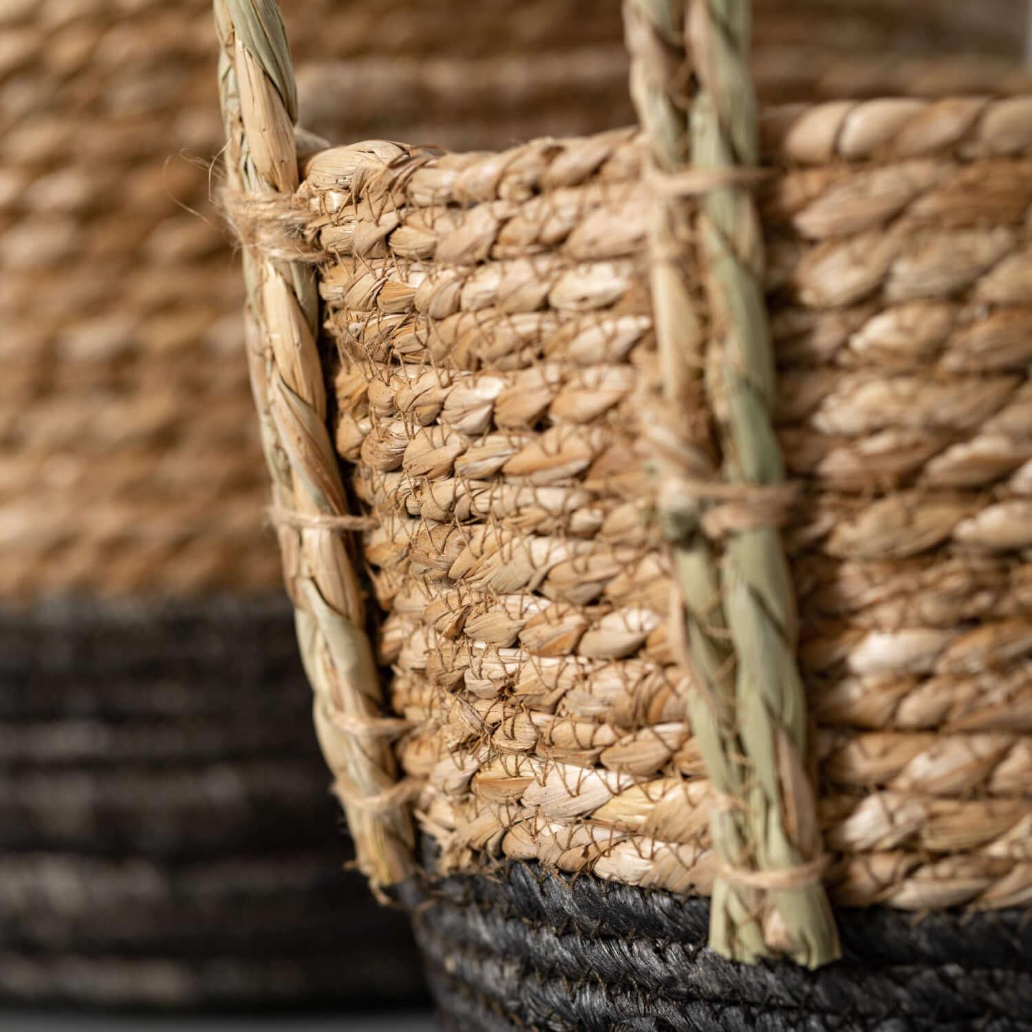 Black washed and natural rattan add a dose of charm and refinement to this pair of natural baskets.