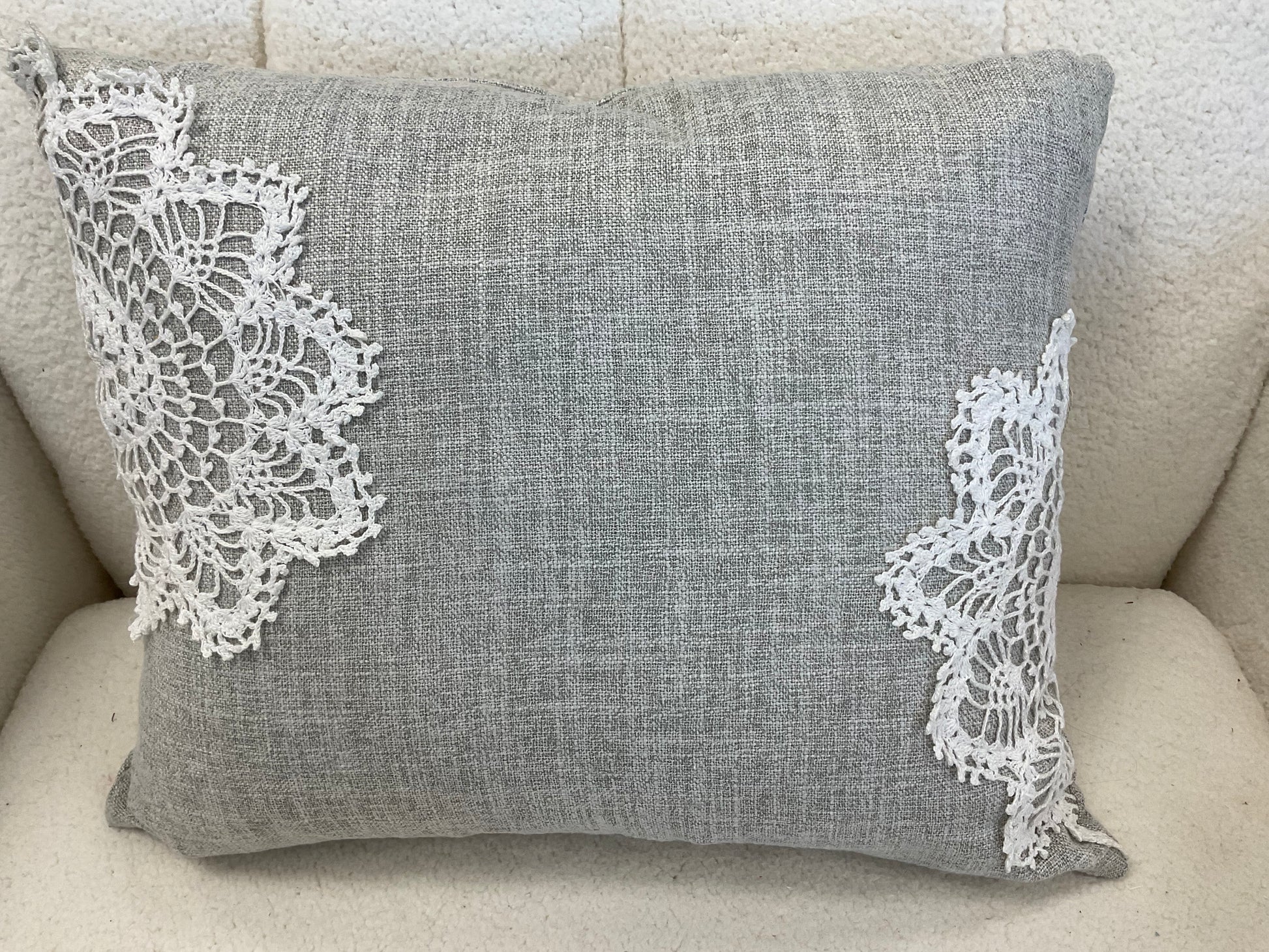 Luxurious Linen with appliquéd doilies gives this pillow a timeless look. Includes an 18 x 18” microfibre insert. Has a zippered closure for easy removal. A lovely throw cushion for living or bedroom.