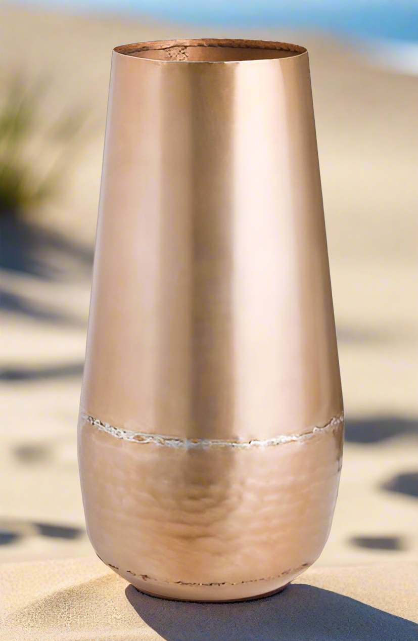 This 15” tall metal copper vase is perfect for real or faux florals.