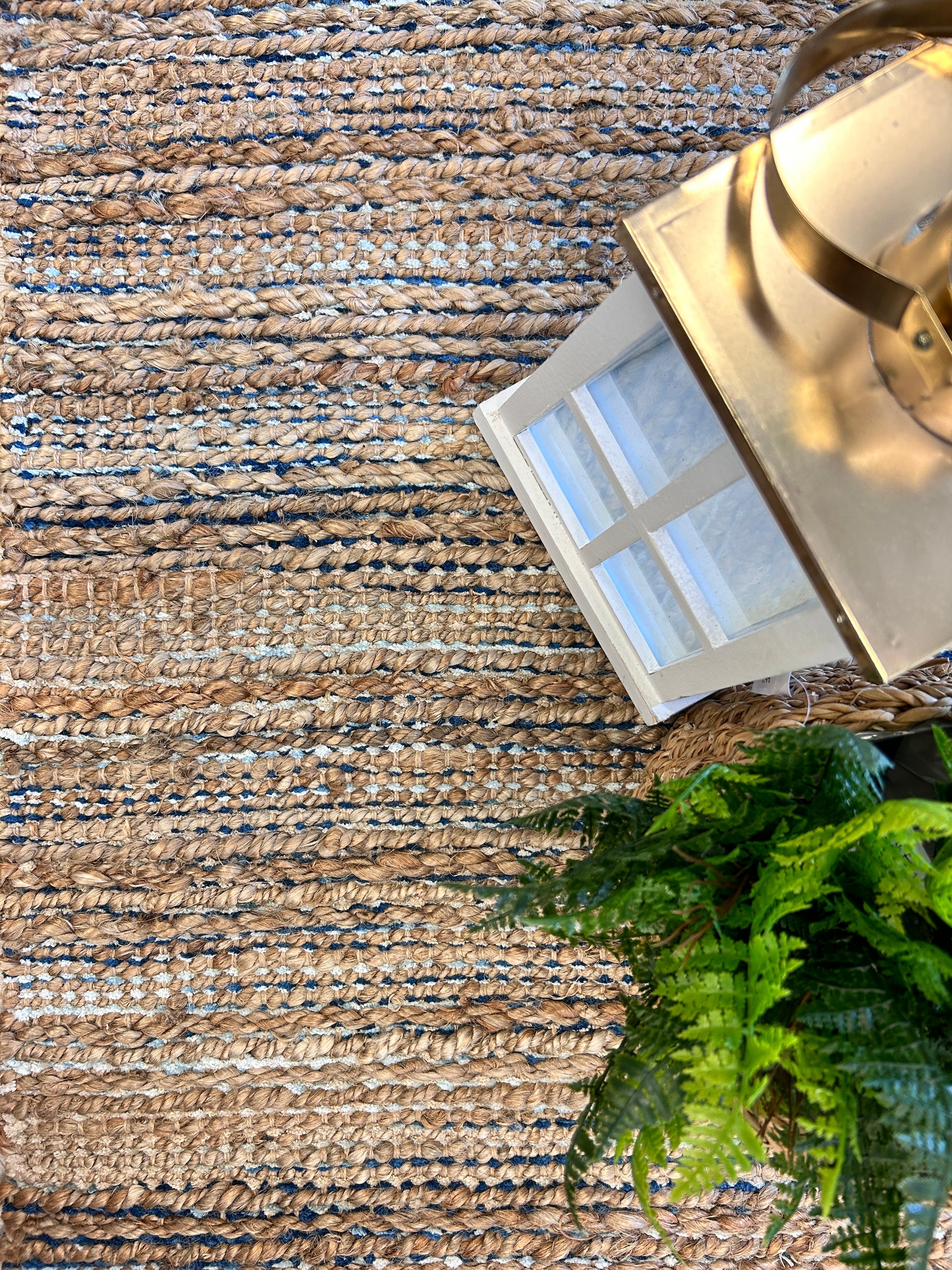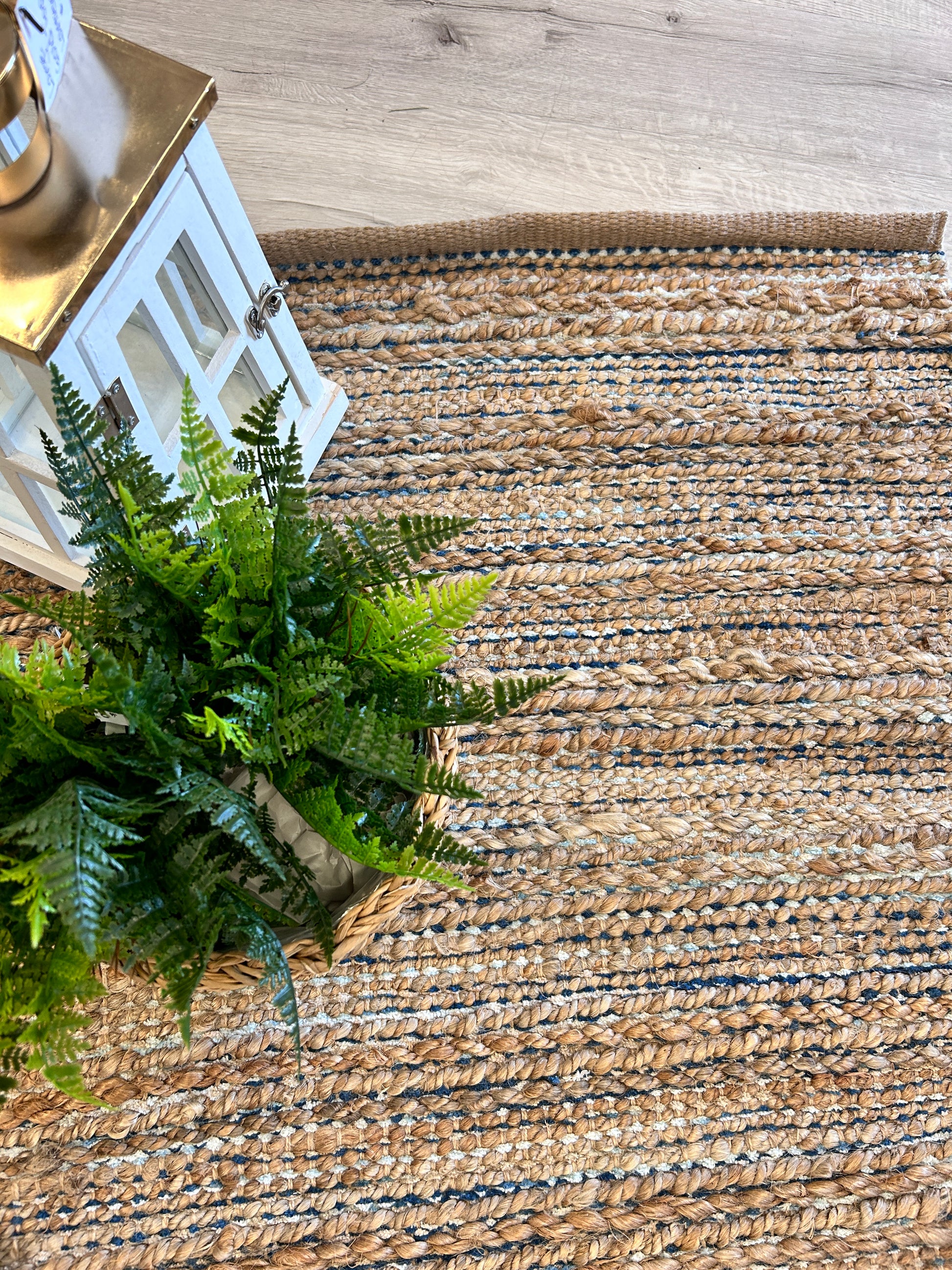 A natural area rug with a contemporary touch, this cotton-backed layer's warm beige tone and hints of blue striated accents make a cool, casual statement. The organic texture of the hand-woven rayon and jute fibers offers an intriguing feel and bohemian-inspired style.