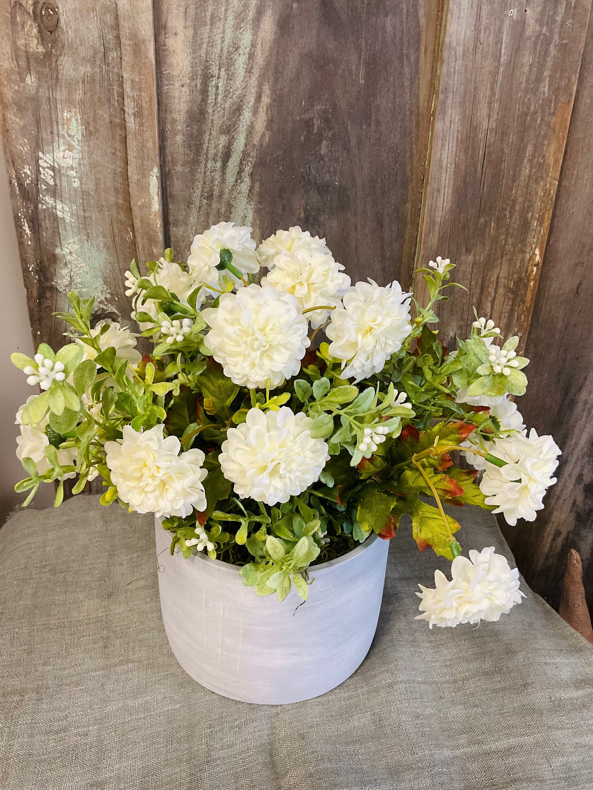 Ivory flowers and seeded greenery give this planter a real meadow look and feel. Stands approximately 11” h x 6” d. Pot is grey washed and made of cement. Great on a kitchen counter, in a bathroom or on a bedside table.