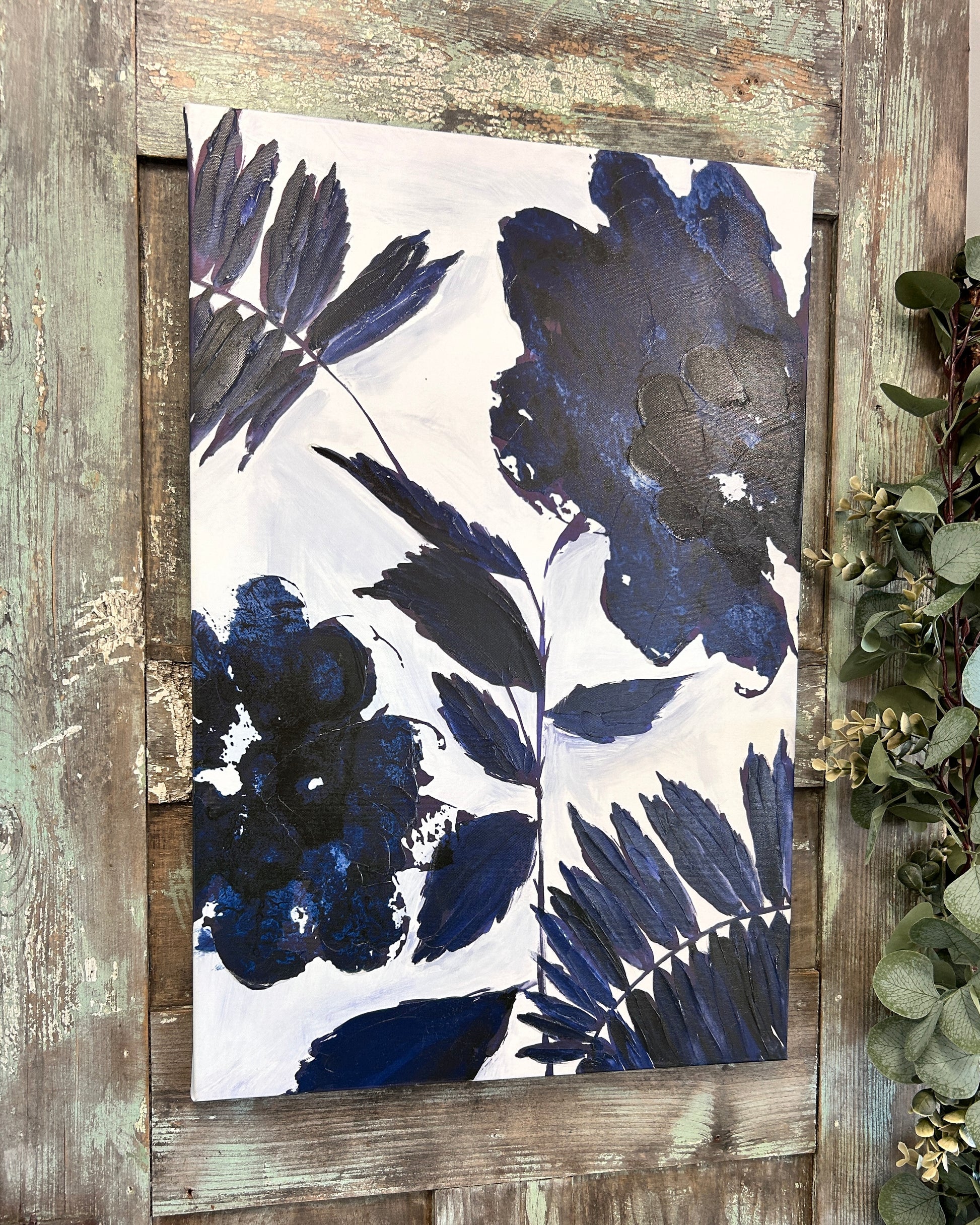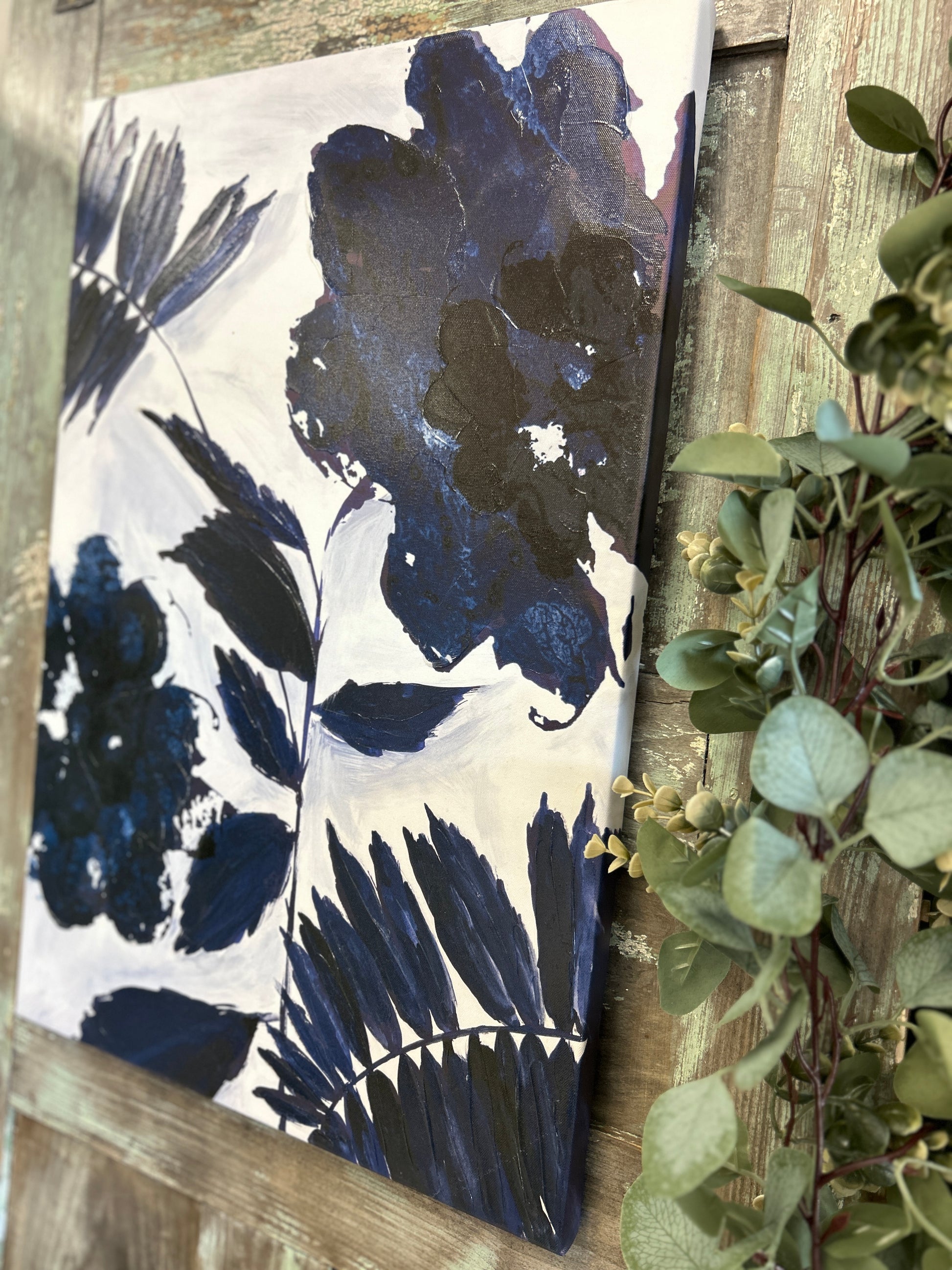Beautiful abstract navy leaves and flowers on a canvas wrapped frame.