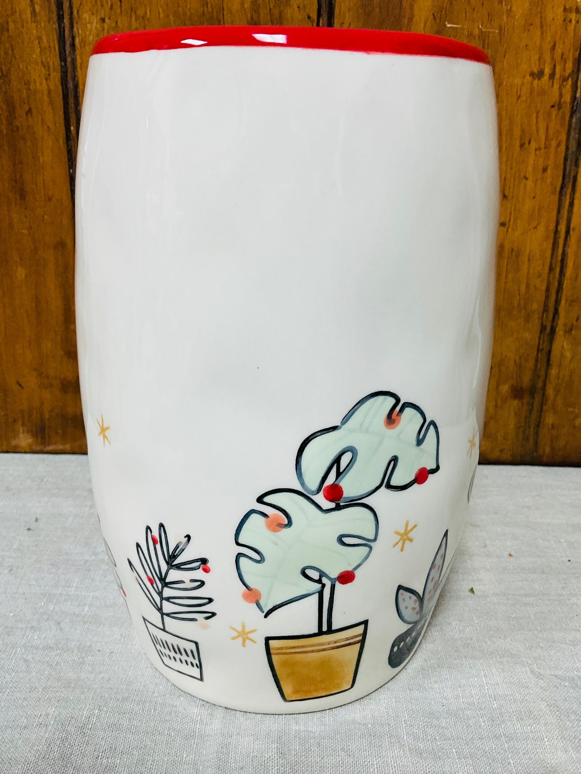 Bring festive cheer to your home with this whimsical Planta Santa Vase. Hand-painted with jolly botanical designs celebrating Santa's favourite plants, this ceramic beauty features a vibrant red rim and luxurious glossy finish that catches the light beautifully. Standing at 8.25 inches tall, it's the perfect size for displaying seasonal florals, dried branches, or simply showcasing as a standalone holiday accent piece. Whether you're decorating for the season or looking for a unique gift that blends nature and festive spirit, this charming vase brings warmth and personality to any room.