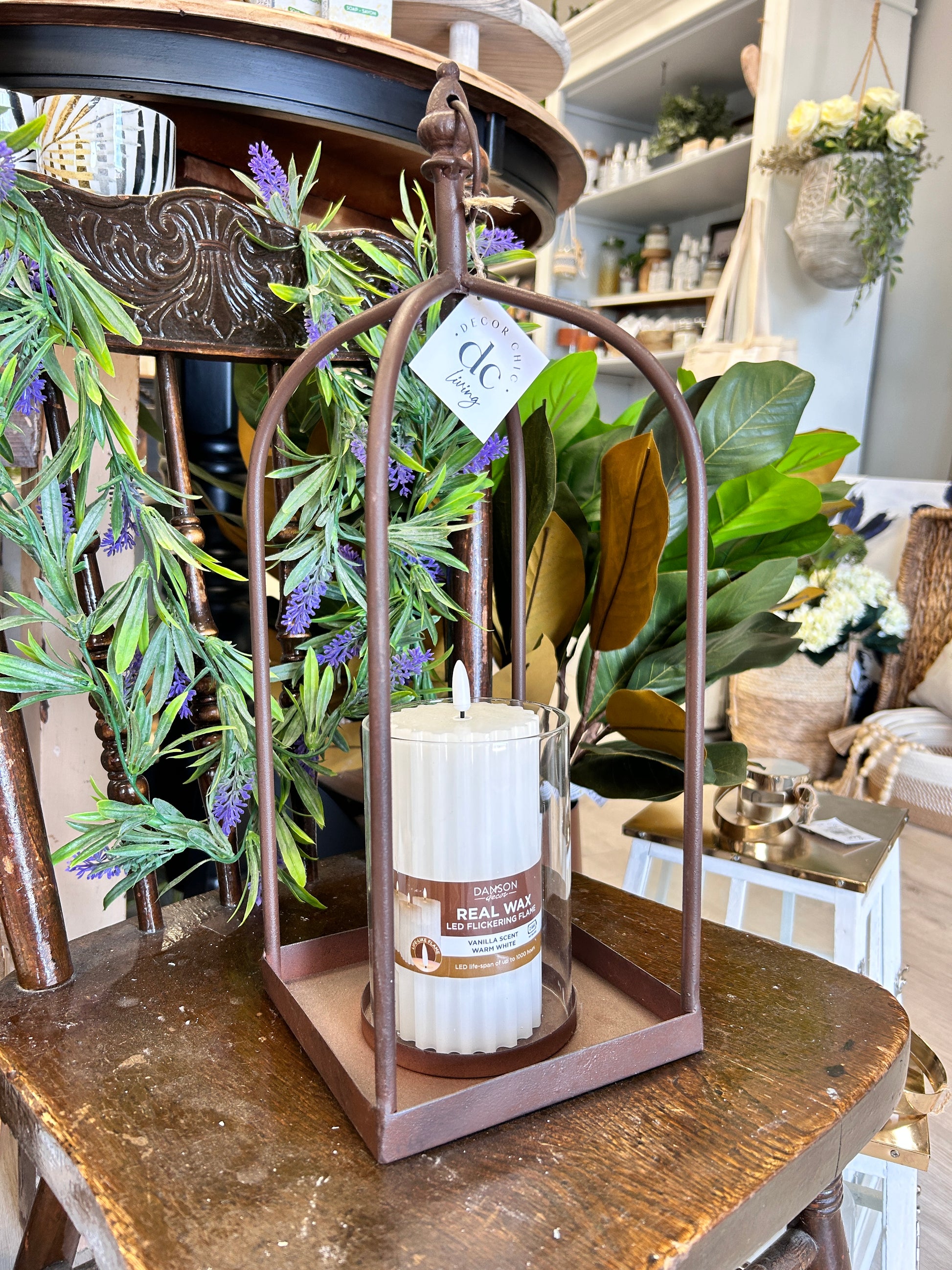 The cutest porch lantern ever! Light weight and holds a slim candle in a glass cylinder.
