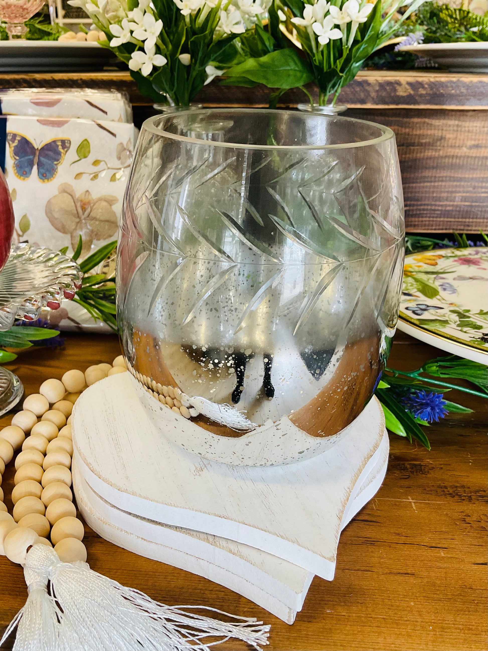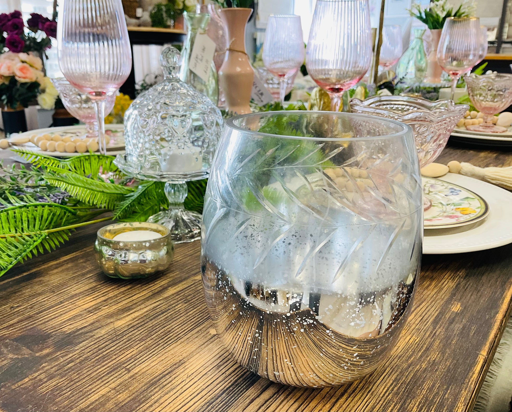 This gorgeous cut glass votive holder with a silver mercury band looks stunning with a candle. It measures 4.25"dia. x 5.25"h.