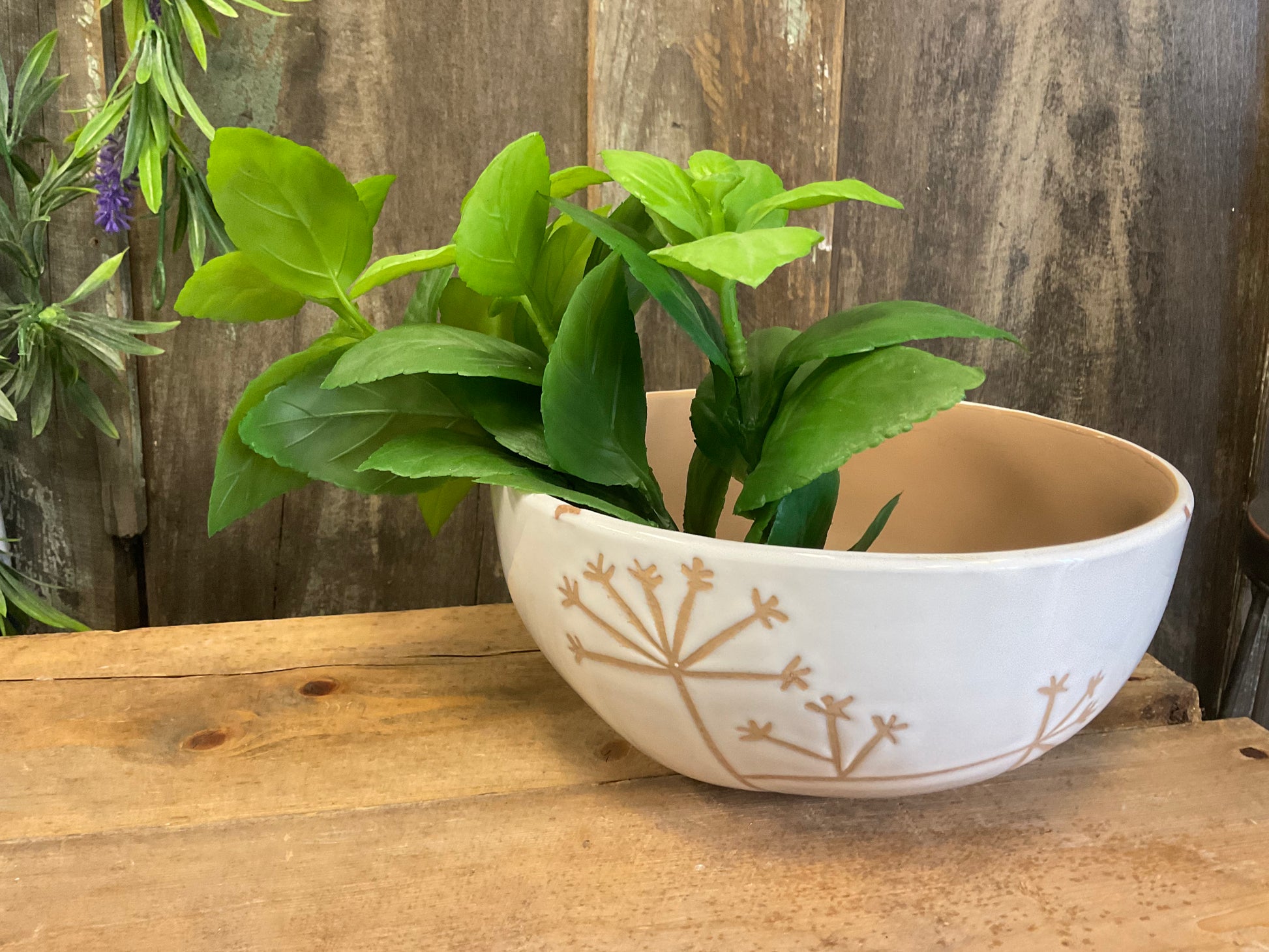Umbel Bowl has a terracotta pottery interior and white, glazed exterior with a botanical embellishment.